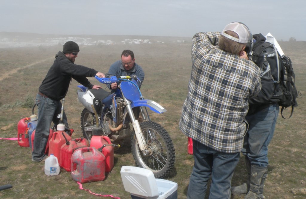 Michael came into the pits, and we got him refueled. The comradery between teams was hard to believe. This stranger is helping me get the bike fueled and ready to roll. After it was filled up, I turned around to set the fuel tank down, after I turned around he already had the bike fired up and ready for Michael.